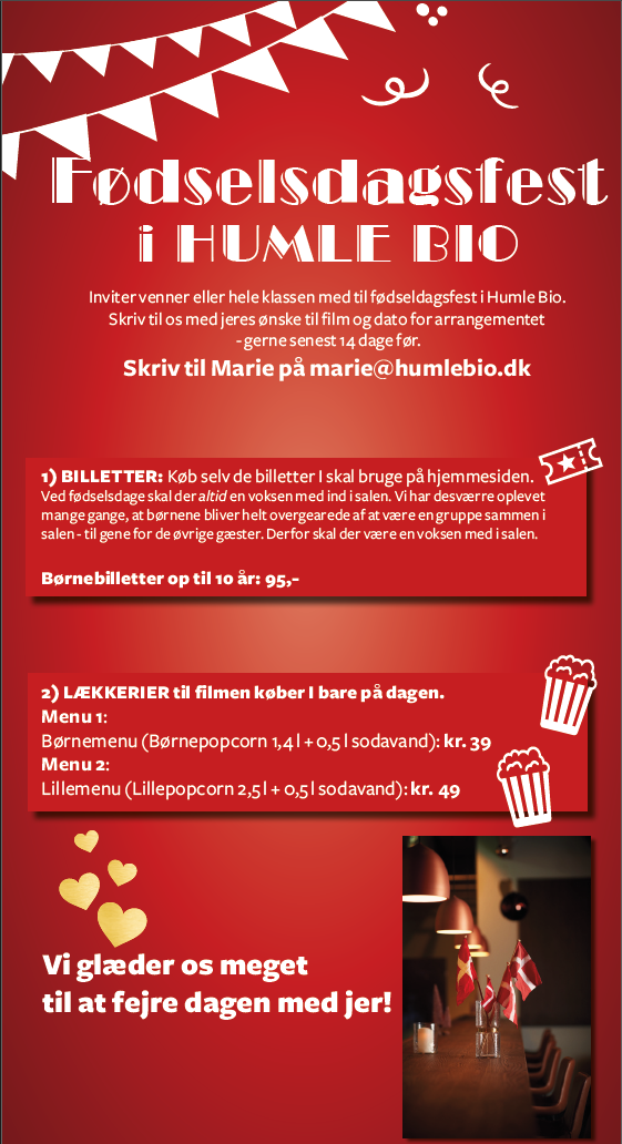 Få en helt særlig dag - i Humle Bio. Det ville glæde os at fejre den med jer;)